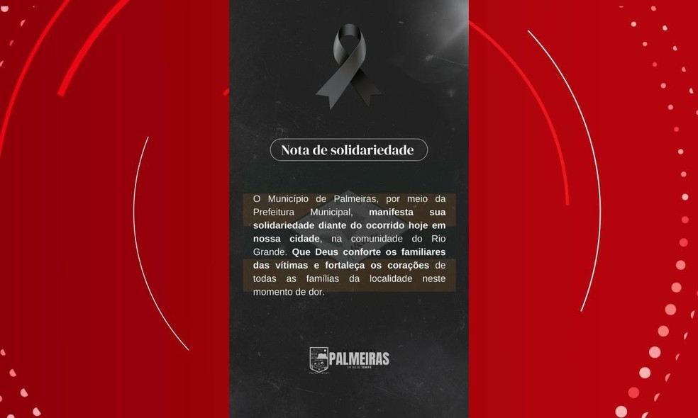 "Que Deus conforte os familiares das vítimas e fortaleça os corações de todas as famílias da localidade neste momento de dor", escreveu a gestão municipal de Palmeiras.