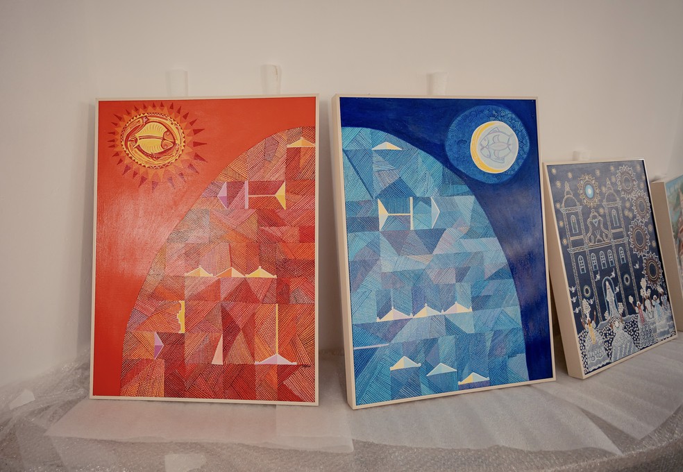 | Obras Dia (à esquerda) e Noite (ao centro), da artista Babalu, e Igreja do Bonfim (à direita), do artista Raimundo Nonato — Foto: Daniel Cerqueira |